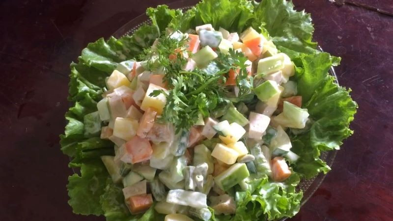 Nguyên liệu: 100g khoai sọ luộc, 50g xà lách, cà chua, dưa leo, 1 thìa cà phê giấm táo, ít tiêu, muối.